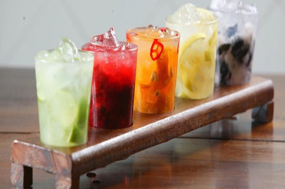 E os meninos sorriem de orelha a orelha é com a inovação da casa: uma tábua de caipirinhas (creiam, irmãos. É verdade!) feita com cinco opções do drinque em copos menores (de 200 ml cada).