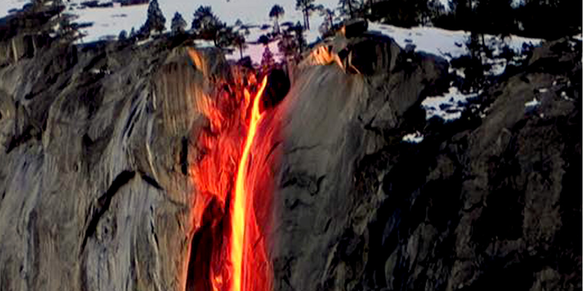 Você já viu uma cachoeira que parece lava derretida descendo uma montanha? Pois é, ela existe! Nem sempre, mas existe! O que acontece é que, em algumas semanas, geralmente em fevereiro (fim do inverno por aqui), a luz do pôr do sol bate no ângulo perfeito na Horsetail Fall, uma cachoeira sazonal que cai do gigante El Capitan, e a água fica iluminada como se estivesse pegando fogo – espetáculo que hoje pode até parecer truques de imagem, tão banalizados que estão, mas ao vivo é surreal!