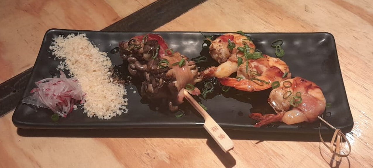 Porém, para nós, a delícia certa para acompanhar as bebidas foram os espetinhos grelhados no carvão. Espetinho japonês? Sim! E estavam deliciosos! Pedimos de camarão, de “sobrecoxa Tai com amendoim”, de “shimeji com bacon e molho tarê”, de abobrinha e de berinjela. Vegetarianos e veganos contemplados!